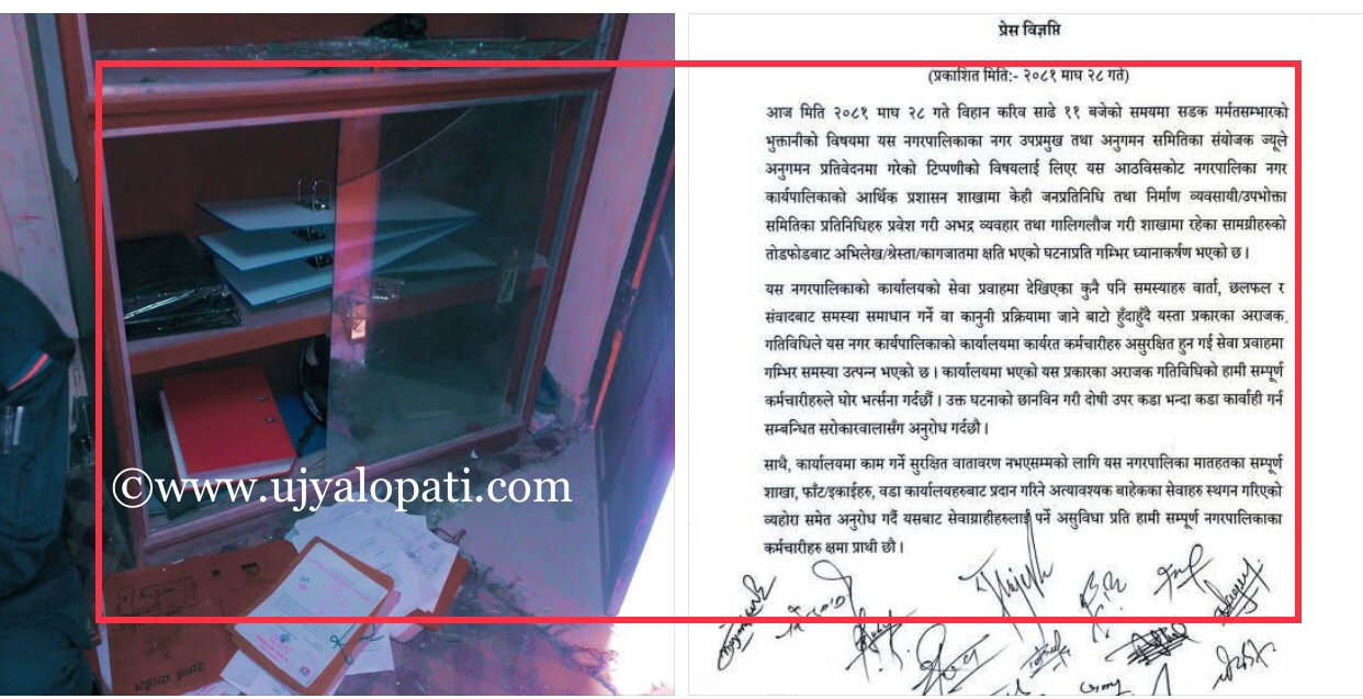 जनप्रतिनिधि बाटै आठबिसकोट नगरपालिकामा तोड्फोड, अनिश्चितकालका लागि