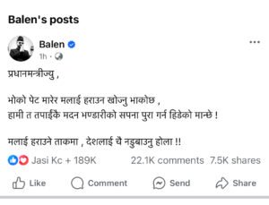 • काठमाडौँ । काठमाडौँ महानगरपालिकाका मेयर बालेन्द्र साह (बालेन)ले आफूलाई हराउने ताकमा देशलाई नडुबाउन प्रधानमन्त्री केपि शर्मा ओलिलाई आग्रह गरेका छन् । उनले सामाजिक सञ्जालमा शुक्रबार साँझ एक स्ट्याटस लेख्दै प्रधानमन्त्रीले भोको पेट मारेर आफूलाई हराउन खोजेको टिप्पणी गरेका हुन् ।