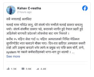झुटो आरोप लगाएर रामेछापबाट हेटौँ अस्पतालमा सरुवा गराएको तर हाजिर स्वास्थ्य मन्त्रालयमा गराईएको छ। ‘मलाई धेरै दुख दिए, अहिले यो दुख/पीडा सहन अनि सोचन पनि सकेको छैन। मैले जिन्दगीबाट नै हार खाए,’ उनले लेखेका छन्, ‘कतैबाट केही साथ सहयोग पाउन सकिनँ।’
